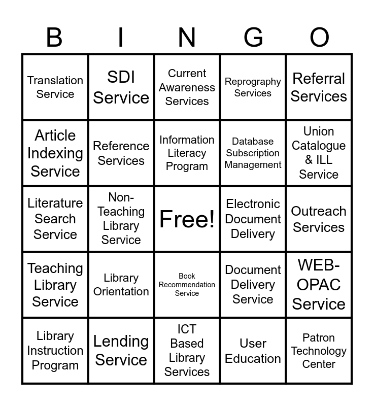 This bingo card has a free space and 24 words: Library Instruction Program, Library Orientation, Information Literacy Program, User Education, Referral Services, Translation Service, SDI Service, Current Awareness Services, Electronic Document Delivery, Outreach Services, Literature Search Service, Reference Services, Document Delivery Service, WEB-OPAC Service, Article Indexing Service, Lending Service, ICT Based Library Services, Reprography Services, Union Catalogue & ILL Service, Teaching Library Service, Non-Teaching Library Service, Book Recommendation Service, Database Subscription Management and Patron Technology Center.