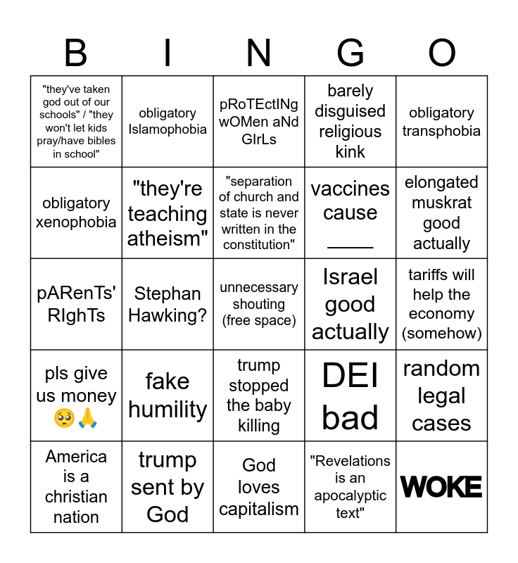 This bingo card has a free space and 24 words: fake humility, trump sent by God, "separation of church and state is never written in the constitution", America is a christian nation, obligatory transphobia, "they've taken god out of our schools" / "they won't let kids pray/have bibles in school", obligatory xenophobia, obligatory Islamophobia, Israel good actually, trump stopped the baby killing, vaccines cause ____, pARenTs' RIghTs, DEI bad, random legal cases, "they're teaching atheism", "Revelations is an apocalyptic text", tariffs will help the economy (somehow), pRoTEctINg wOMen aNd GIrLs, elongated muskrat good actually, Stephan Hawking?, WOKE, pls give us money π₯Ίπ, barely disguised religious kink and God loves capitalism.