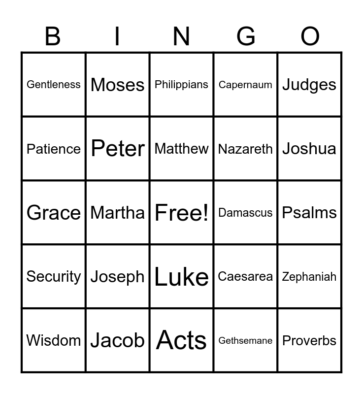 This bingo card has a free space and 75 words: Joy, Jesus, Matthew, Jerusalem, Genesis, Love, Solomon, Mark, Bethlehem, Exodus, Peace, Abraham, Luke, Nazareth, Leviticus, Patience, Jacob, John, Galilee, Joshua, Kindness, Moses, Acts, Capernaum, Judges, Goodness, David, Romans, Sodom, Job, Faithfulness, Ruth, 1 Corinthians, Caesarea, Psalms, Gentleness, Daniel, Galatians, Damascus, Proverbs, Self-Control, Mary, Ephesians, Egypt, Lamentations, Victory, Martha, Philippians, Babylon, Malachi, Healing, Peter, Colossians, Nineveh, Ecclesiastes, Salvation, Isaiah, 1 Thessalonians, Jericho, Jeremiah, Wisdom, Jonah, 1 Timothy, Samaria, Ezekiel, Grace, Esther, Hebrews, Bethany, Zephaniah, Security, Joseph, Revelation, Gethsemane and Haggai.