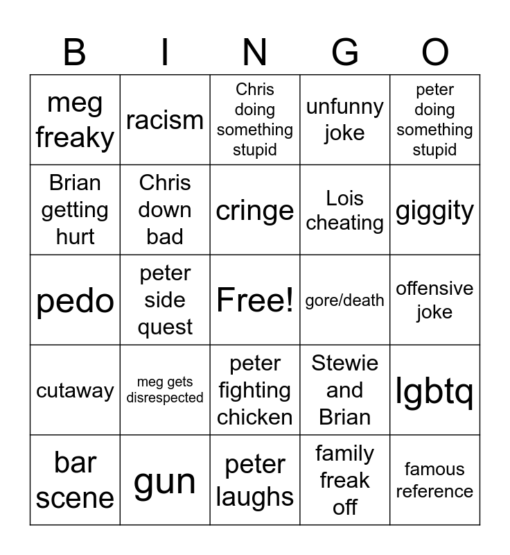 This bingo card has a free space and 24 words: bar scene, meg gets disrespected, cringe, family freak off, peter doing something stupid, meg freaky, racism, Chris doing something stupid, gore/death, offensive joke, pedo, Chris down bad, Stewie and Brian, lgbtq, Brian getting hurt, gun, peter laughs, unfunny joke, giggity, cutaway, peter side quest, peter fighting chicken, Lois cheating and famous reference.