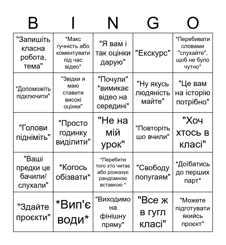 This bingo card has 25 words: *Когось обізвати*, "Виходимо на фінішну пряму", "Почули" *вимикає відео на середині*, "Здайте проєкти", *Перебивати словами "слухайте", щоб не було чутно*, "Запишіть класна робота, тема", "Допоможіть підключити", *Макс гучність або коментувати під час відео*, "Повторіть шо вчили", *Перебити того хто читає або розказує рандомною вставкою *, "Ну якусь людяність майте", "Голови підніміть", "Свободу попугаям", *Доїбатись до перших парт*, "Звідки я маю ставити високі оцінки", "Можете підготувати якийсь проєкт", "Хоч хтось в класі", "Я вам і так оцінки дарую", "Це вам на історію потрібно", "Просто годинку виділити", "Не на мій урок", *Вип'є води*, "Ваші предки це бачили/слухали", "Екскурс" and "Все ж в гугл класі".