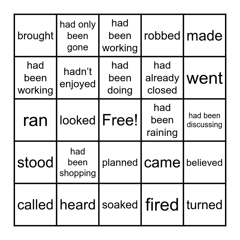 This bingo card has a free space and 60 words: had never eaten, had been shopping, had heard, had never tried, had been discussing, had just come out, hadn’t enjoyed, had watched, had been raining, hadn't finished, had been working, hadn't even been born, had already closed, hadn't seen, had left, had only been gone, had been doing, robbed, recorded, ran, looked, had been working, saw, went, chose, ordered, planned, said, made, tried, discussed, came, enjoyed, watched, brought, got, wanted, came, walked, stood, were looking, soaked, fired, lost, started, loved, worked, left, closed, called, heard, thought, noticed, turned, stopped, explained, went, missed, believed and remembered.