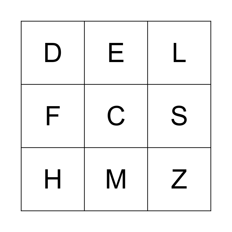 This bingo card has a free space and 8 words: S, L, E, H, D, Z, F and M.