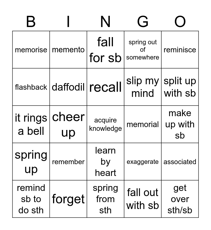 This bingo card has a free space and 24 words: remember, forget, recall, remind sb to do sth, reminisce, memorise, flashback, memento, memorial, learn by heart, slip my mind, it rings a bell, exaggerate, associated, daffodil, fall out with sb, make up with sb, fall for sb, split up with sb, cheer up, get over sth/sb, spring up, spring out of somewhere and spring from sth.