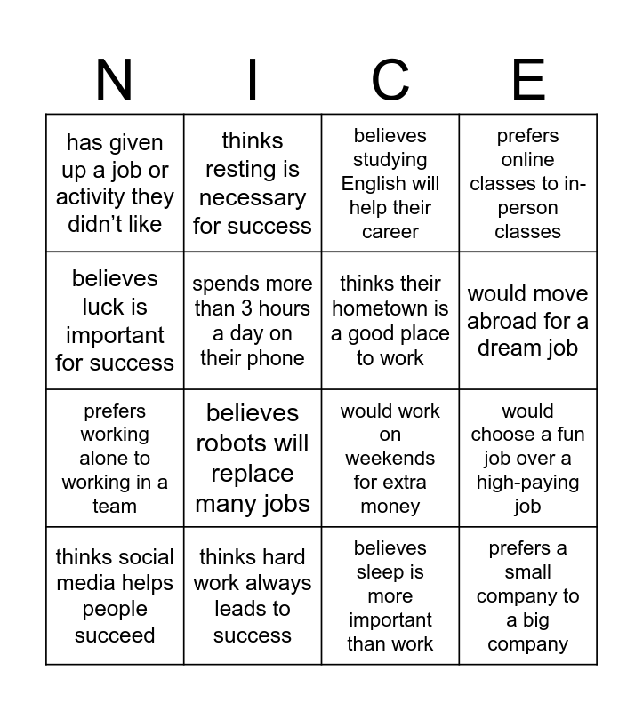 This bingo card has 16 words: thinks hard work always leads to success, would choose a fun job over a high-paying job, believes studying English will help their career, has given up a job or activity they didn’t like, prefers working alone to working in a team, thinks resting is necessary for success, would work on weekends for extra money, believes sleep is more important than work, believes luck is important for success, spends more than 3 hours a day on their phone, thinks social media helps people succeed, prefers online classes to in-person classes, believes robots will replace many jobs, would move abroad for a dream job, thinks their hometown is a good place to work and prefers a small company to a big company.