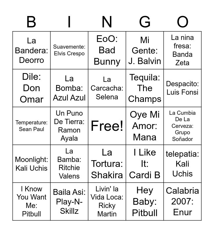 This bingo card has a free space and 48 words: Culo: Pitbull, Calabria 2007: Enur, Bidi Bidi Bom Bom: Selena, Livin' la Vida Loca: Ricky Martin, La Bamba: Ritchie Valens, Gasolina: Daddy Yankee, Suavemente: Elvis Crespo, La Vida Es Un Carnaval: Celia Cruz, Dile: Don Omar, La Negra Tiene Tumbao: Celia Cruz, La Bomba: Azul Azul, Mi Gente: J. Balvin, telepatia: Kali Uchis, I Like It: Cardi B, Llorar: Los Socios Del Ritmo, Baila Esta Cumbia: Selena, La Carcacha: Selena, Oye Mi Amor: Mana, La Chona: Los Tucanes De Tijuana, La nina fresa: Banda Zeta, Un Puno De Tierra: Ramon Ayala, Hey Baby: Pitbull, La Bandera: Deorro, Tequila: The Champs, Cinco De Mayo: Pitbull, Despacito: Luis Fonsi, I Know You Want Me: Pitbull, La Camisa Negra: Juanes, La Tortura: Shakira, Moonlight: Kali Uchis, Rabiosa: Shakira, La Duena del Swing: Los Hermanos Rosario, La Puerta Negra: Los Tigres Del Norte, El Colesterol: Fito Olivares, Baila Asi: Play-N-Skillz, Como Te Voy A Olvidar: Los Angeles Azules, Como La Flor: Selena, La Cumbia De La Cerveza: Grupo Soñador, Techno Cumbia: Selena, Volver, Volver: Vicente Fernandez, El Rey: Vicente Fernandez, Hips Don't Lie: Shakira, EoO: Bad Bunny, Degenere: Myke Towers, Temperature: Sean Paul, Beautiful Liar: Beyonce, In Da Ghetto: J. Balvin and No Me Dejes Solo: Daddy Yankee.