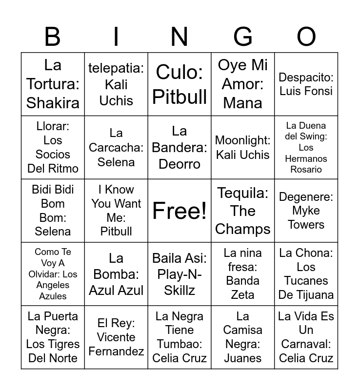 This bingo card has a free space and 48 words: Suavemente: Elvis Crespo, La Vida Es Un Carnaval: Celia Cruz, Dile: Don Omar, La Negra Tiene Tumbao: Celia Cruz, La Bomba: Azul Azul, Mi Gente: J. Balvin, telepatia: Kali Uchis, I Like It: Cardi B, Llorar: Los Socios Del Ritmo, Baila Esta Cumbia: Selena, La Carcacha: Selena, Oye Mi Amor: Mana, La Chona: Los Tucanes De Tijuana, La nina fresa: Banda Zeta, Un Puno De Tierra: Ramon Ayala, Hey Baby: Pitbull, La Bandera: Deorro, Tequila: The Champs, Cinco De Mayo: Pitbull, Despacito: Luis Fonsi, I Know You Want Me: Pitbull, La Camisa Negra: Juanes, La Tortura: Shakira, Moonlight: Kali Uchis, Rabiosa: Shakira, La Duena del Swing: Los Hermanos Rosario, La Puerta Negra: Los Tigres Del Norte, El Colesterol: Fito Olivares, Baila Asi: Play-N-Skillz, Como Te Voy A Olvidar: Los Angeles Azules, Como La Flor: Selena, La Cumbia De La Cerveza: Grupo Soñador, Techno Cumbia: Selena, Volver, Volver: Vicente Fernandez, El Rey: Vicente Fernandez, Hips Don't Lie: Shakira, EoO: Bad Bunny, Degenere: Myke Towers, Temperature: Sean Paul, Beautiful Liar: Beyonce, In Da Ghetto: J. Balvin, No Me Dejes Solo: Daddy Yankee, Culo: Pitbull, Calabria 2007: Enur, Bidi Bidi Bom Bom: Selena, Livin' la Vida Loca: Ricky Martin, La Bamba: Ritchie Valens and Gasolina: Daddy Yankee.