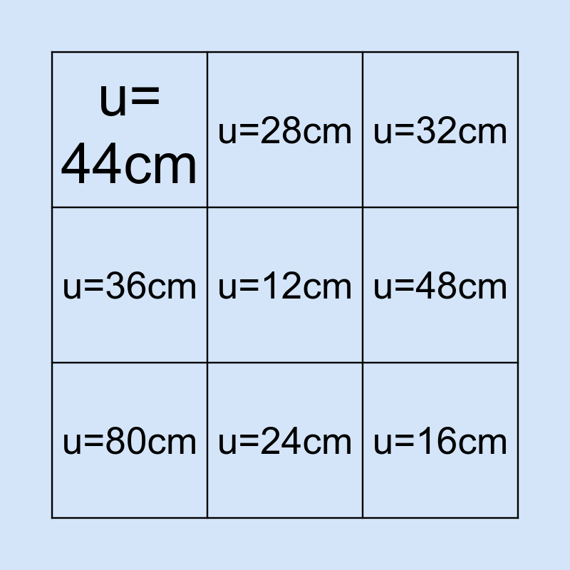 This bingo card has 9 words: u=80cm, u=32cm, u=28cm, u=36cm, u= 44cm, u=48cm, u=12cm, u=16cm and u=24cm.