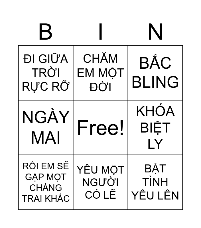 This bingo card has a free space and 20 words: MẤT KẾT NỐI, TÁI SINH, BẮC BLING, THỦY TRIỀU, CẮT ĐÔI NỔI SẦU, BẬT TÌNH YÊU LÊN, TUYẾT YÊU THƯƠNG, ĐI GIỮA TRỜI RỰC RỠ, TẤT CẢ HOẶC KHÔNG LÀ GÌ CẢ, CHĂM EM MỘT ĐỜI, Người Tình Mai Ya Hee, TÌNH ĐẦU QUÁ CHÉN, KHÓA BIỆT LY, GẶP LẠI NĂM TA 60, RỒI EM SẼ GẶP MỘT CHÀNG TRAI KHÁC, YÊU LẠI TỪ ĐẦU, YÊU MỘT NGƯỜI CÓ LẼ, NGÀY MAI, SÓNG GIÓ and ĐAU XÓT LÝ CON CUA.