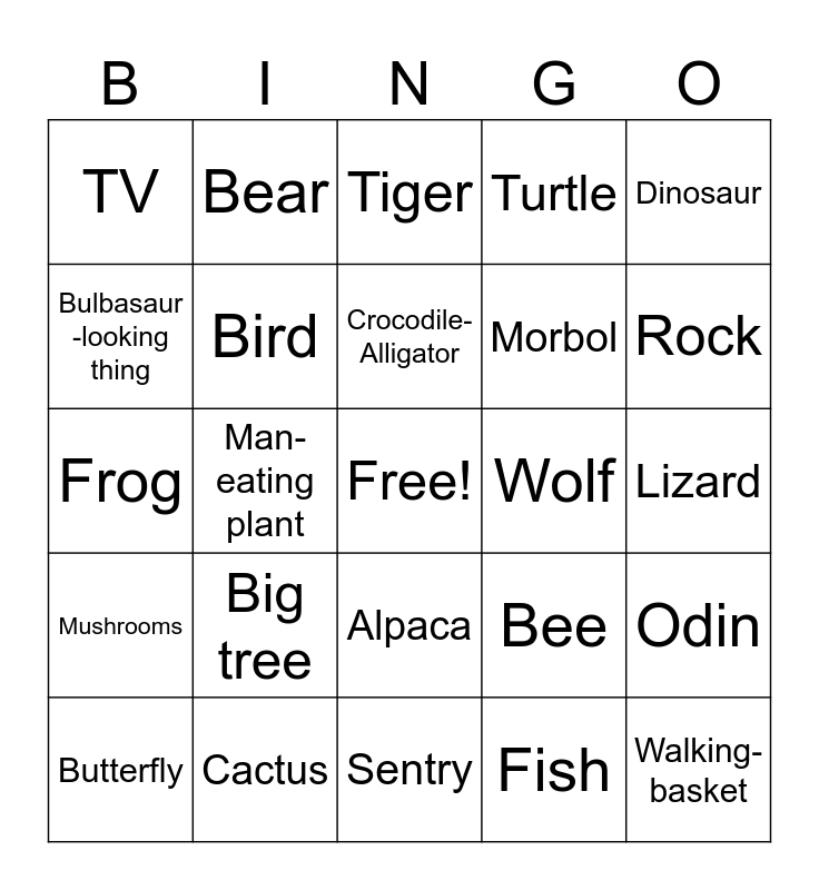 This bingo card has a free space and 24 words: Big tree, Cactus, Crocodile-Alligator, Butterfly, Dinosaur, TV, Bulbasaur -looking thing, Bear, Wolf, Alpaca, Morbol, Frog, Bee, Odin, Bird, Fish, Lizard, Tiger, Rock, Man-eating plant, Walking-basket, Mushrooms, Turtle and Sentry.