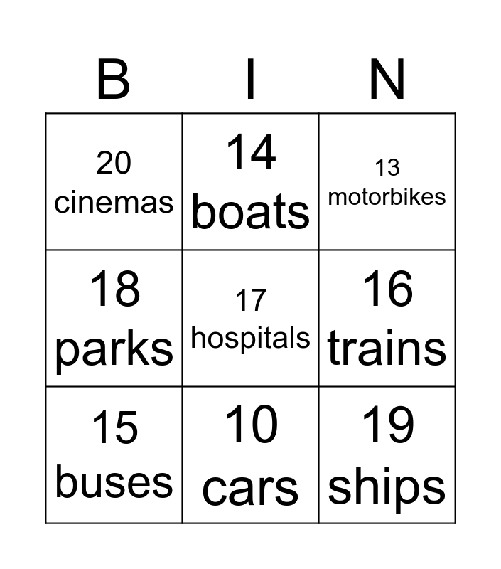 This bingo card has a free space and 11 words: 12 helicopters, 10 cars, 19 ships, 15 buses, 14 boats, 13 motorbikes, 16 trains, 20 planes, 18 parks, 20 cinemas and 11 shops.