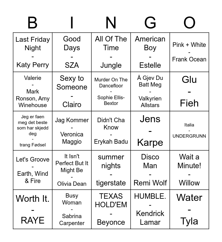 This bingo card has 30 words: Busy Woman - Sabrina Carpenter, Good Luck, Babe - Chappell Roan, Jag Kommer - Veronica Maggio, Ain't no Mountain High - Marvin Gaye, Last Friday Night - Katy Perry, All Of The Time - Jungle, Sexy to Someone - Clairo, summer nights - tigerstate, Jens - Karpe, TEXAS HOLD'EM - Beyonce, Italia - UNDERGRUNN, Didn't Cha Know - Erykah Badu, HUMBLE. - Kendrick Lamar, Water - Tyla, Glu - Fieh, See You Again - Tyler, The Creator, Disco Man - Remi Wolf, Let's Groove - Earth, Wind & Fire, It Isn't Perfect But It Might Be - Olivia Dean, Pink + White - Frank Ocean, Jeg er faen meg det beste som har skjedd deg - trang Fødsel, Alene - Arif Murakami, Good Days - SZA, Å Gjev Du Batt Meg - Valkyrien Allstars, Valerie - Mark Ronson, Amy Winehouse, American Boy - Estelle, Wait a Minute! - Willow, Worth It. - RAYE, Murder On The Dancefloor - Sophie Ellis- Bextor and Hard Times - Paramore.