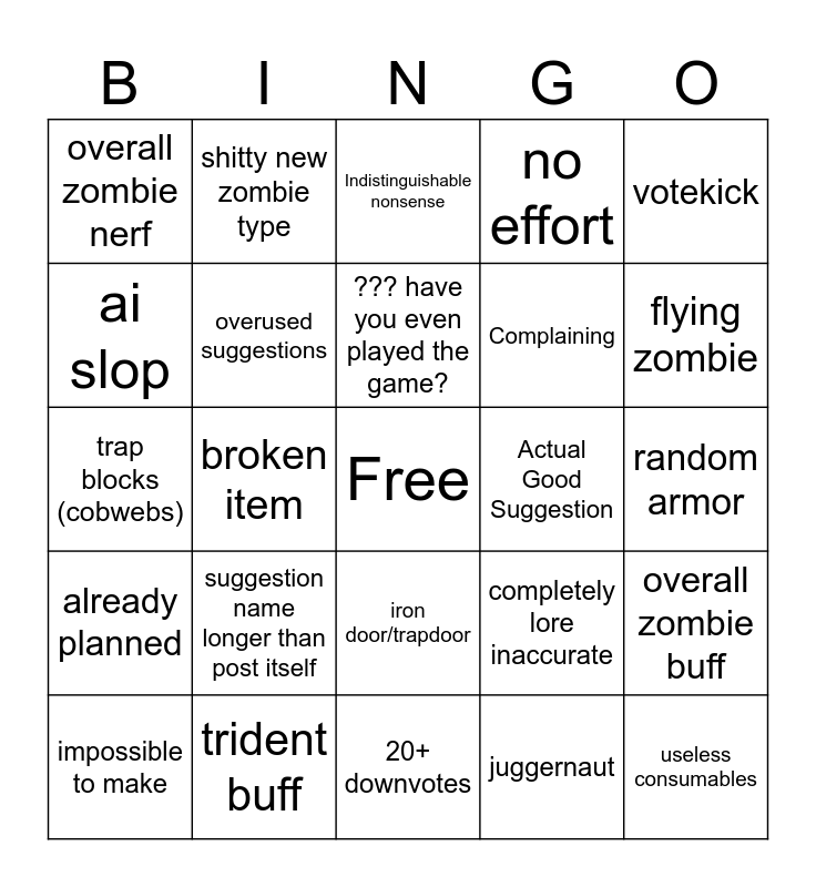 This bingo card has a free space and 24 words: suggestion name longer than post itself, trident buff, ??? have you even played the game?, impossible to make, votekick, overall zombie nerf, ai slop, shitty new zombie type, Actual Good Suggestion, iron door/trapdoor, Complaining, trap blocks (cobwebs), completely lore inaccurate, overall zombie buff, overused suggestions, juggernaut, random armor, Indistinguishable nonsense, flying zombie, broken item, useless consumables, already planned, no effort and 20+ downvotes.