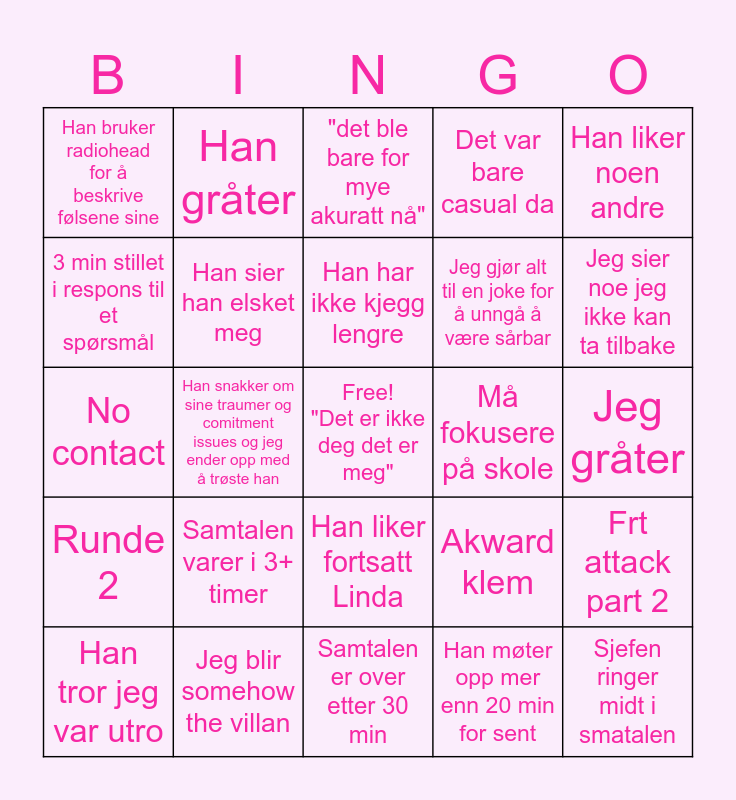 This bingo card has a free space and 24 words: Samtalen varer i 3+ timer, Jeg blir somehow the villan, Han har ikke kjegg lengre, Han tror jeg var utro, Han liker noen andre, Han bruker radiohead for å beskrive følsene sine, 3 min stillet i respons til et spørsmål, Han gråter, Må fokusere på skole, Han liker fortsatt Linda, Jeg gjør alt til en joke for å unngå å være sårbar, No contact, Akward klem, Frt attack part 2, Han sier han elsket meg, Han møter opp mer enn 20 min for sent, Jeg gråter, "det ble bare for mye akuratt nå", Jeg sier noe jeg ikke kan ta tilbake, Han snakker om sine traumer og comitment issues og jeg ender opp med å trøste han, Sjefen ringer midt i smatalen, Runde 2, Det var bare casual da and Samtalen er over etter 30 min.