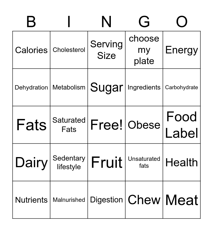 This bingo card has a free space and 29 words: Nutrients, Proteins, Saturated Fats, Fiber, Calories, Serving Size, Metabolism, Sedentary lifestyle, Obese, Malnurished, Food Label, Meat, Digestion, Chew, Carbohydrate, Grains, Fruit, Dairy, Energy, Fats, Unsaturated fats, Vegetable, Ingredients, Dehydration, choose my plate, Cholesterol, Health, Sugar and Sodium.
