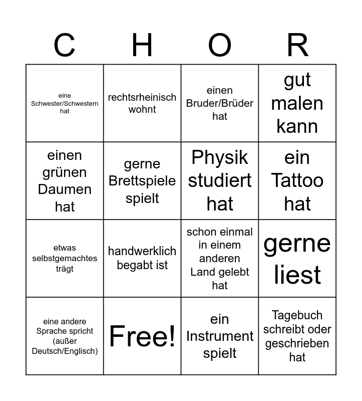 This bingo card has 21 words: Free!, linksrheinisch wohnt, rechtsrheinisch wohnt, in Köln geboren ist, ein Instrument spielt, Physik studiert hat, eine Schwester/Schwestern hat, einen Bruder/Brüder hat, schon einmal in einem anderen Land gelebt hat, ein Tattoo hat, etwas selbstgemachtes trägt, gut malen kann, Tagebuch schreibt oder geschrieben hat, weiß, wie man einen Sonnengruß macht, gerne Brettspiele spielt, ein FSJ gemacht hat, eine andere Sprache spricht (außer Deutsch/Englisch), handwerklich begabt ist, einen grünen Daumen hat, gerne liest and ein verrücktes Hobby hat.