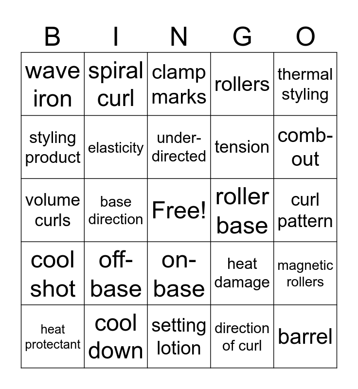 This bingo card has a free space and 44 words: curling iron, barrel, clamp (or tong), heat protectant, sectioning, direction of curl, clamp marks, temperature setting, thermal styling, cool down, rollers, roller base, on-base, off-base, half-off base, setting lotion, directional wrap, volume curls, set time, comb-out, spiral curl, Marcel iron, double barrel iron, wave iron, thermal comb, curl pattern, finger curling, pin curl, heat damage, cool shot, perm rods, magnetic rollers, velcro rollers, mesh rollers, base direction, bricklay pattern, dry setting, wet setting, under-directed, styling product, tension, porosity, elasticity and foam rollers.