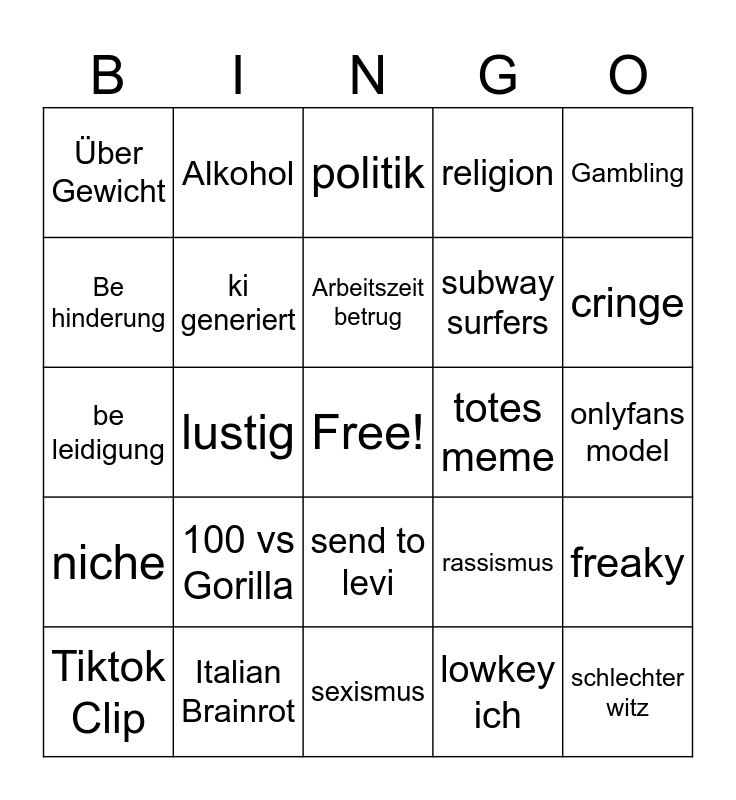 This bingo card has a free space and 24 words: 100 vs Gorilla, Italian Brainrot, Arbeitszeit betrug, Tiktok Clip, Gambling, Über Gewicht, Be hinderung, Alkohol, totes meme, send to levi, subway surfers, be leidigung, rassismus, freaky, ki generiert, lowkey ich, onlyfans model, politik, cringe, lustig, schlechter witz, niche, religion and sexismus.