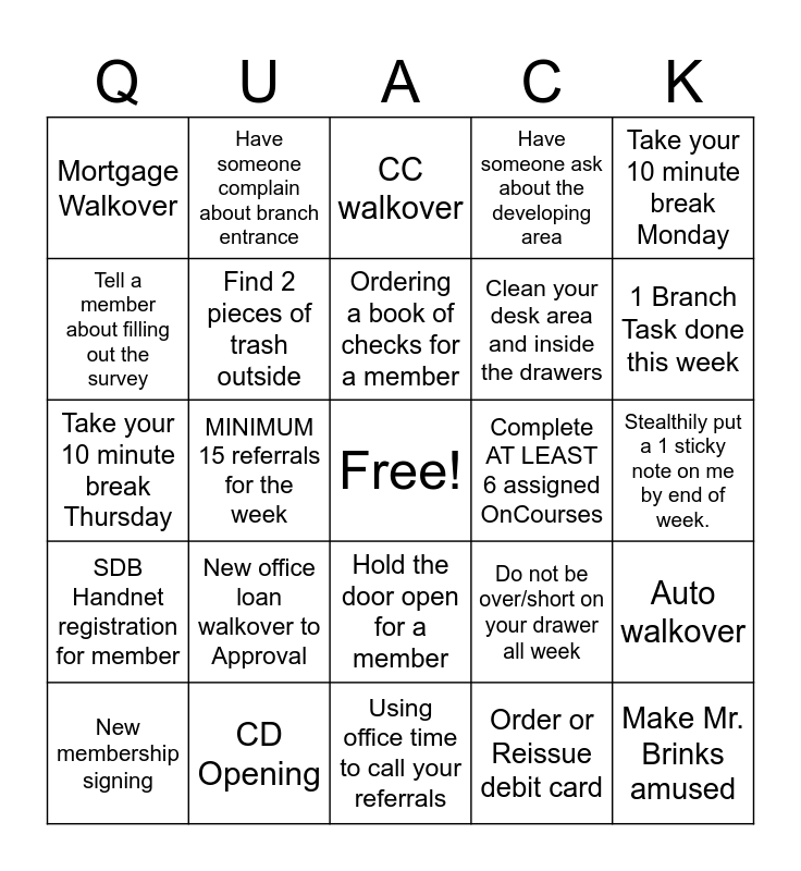 This bingo card has a free space and 24 words: New office loan walkover to Approval, CD Opening, Ordering a book of checks for a member, New membership signing, Take your 10 minute break Monday, Mortgage Walkover, Tell a member about filling out the survey, Have someone complain about branch entrance, Complete AT LEAST 6 assigned OnCourses, Hold the door open for a member, Clean your desk area and inside the drawers, Take your 10 minute break Thursday, Do not be over/short on your drawer all week, Auto walkover, Find 2 pieces of trash outside, Order or Reissue debit card, Stealthily put a 1 sticky note on me by end of week., CC walkover, 1 Branch Task done this week, MINIMUM 15 referrals for the week, Make Mr. Brinks amused, SDB Handnet registration for member, Have someone ask about the developing area and Using office time to call your referrals.