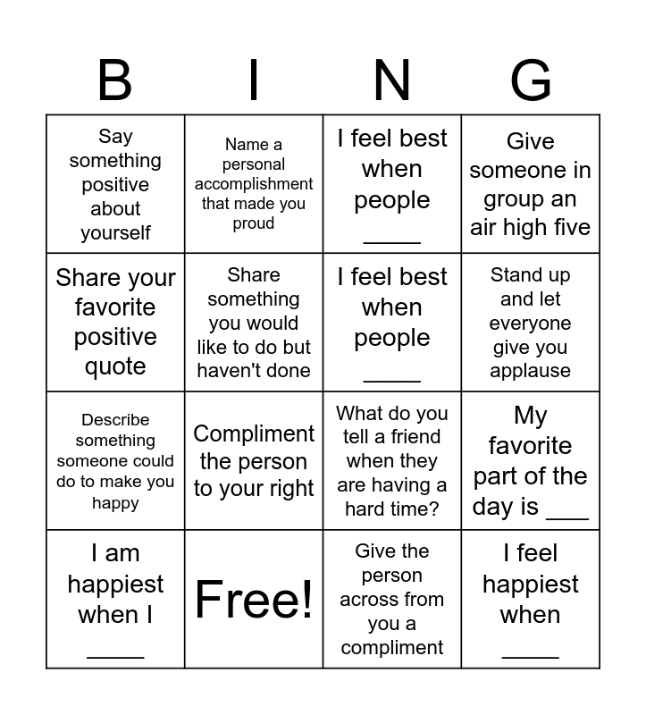 This bingo card has 28 words: If you could be friends with any famous person in history, who would it be and why?, Share a characteristic you admire in others, Describe something someone could do to make you happy, Share the greatest compliment you have ever received, Share something you would like to do but haven't done, I feel best when people ____, Name a personal accomplishment that made you proud, I feel happiest when ____, Free!, Describe your perfect vacation, What do you tell a friend when they are having a hard time?, Give someone in group an air high five, Give a compliment to the person to your left, What is something you want to accomplish today?, Compliment the person to your right, What are three things that make you unique?, I am good at ___, I feel best when people ____, Stand up and let everyone give you applause, Talk about 3 things you are grateful for, Say something positive about yourself, Give a compliment to the person 2nd to your right, I am happiest when I ____, My favorite part of the day is ___, Give the person across from you a compliment, What would your best friend say are some of your strengths, Share your favorite positive quote and what is a quality you admire in others.