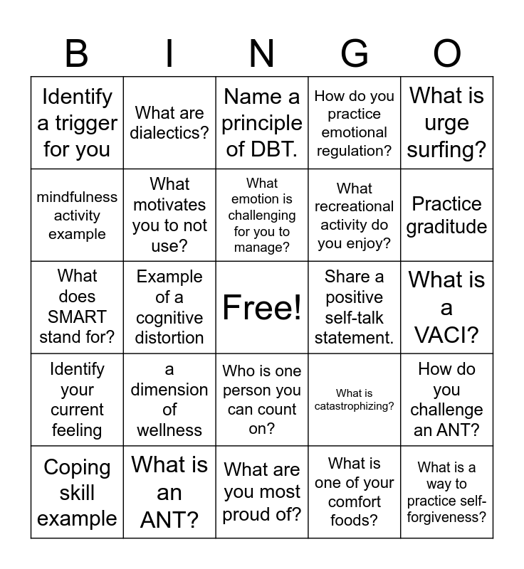 This bingo card has a free space and 24 words: a dimension of wellness, What is an ANT?, What emotion is challenging for you to manage?, Coping skill example, What is urge surfing?, Identify a trigger for you, mindfulness activity example, What are dialectics?, Share a positive self-talk statement., Who is one person you can count on?, What recreational activity do you enjoy?, What does SMART stand for?, What is catastrophizing?, How do you challenge an ANT?, What motivates you to not use?, What is one of your comfort foods?, What is a VACI?, Name a principle of DBT., Practice graditude, Example of a cognitive distortion, What is a way to practice self-forgiveness?, Identify your current feeling, How do you practice emotional regulation? and What are you most proud of?.