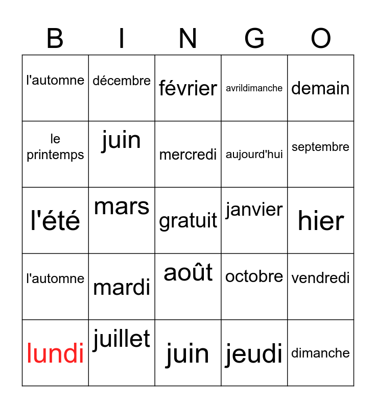 This bingo card has a free space and 24 words: lundi, mardi, mercredi, jeudi, demain, l'automne, décembre, février, janvier, hier, l'été, juin, octobre, vendredi, le printemps, juillet, juin, avrildimanche, septembre, l'automne, mars, août, aujourd'hui and dimanche.