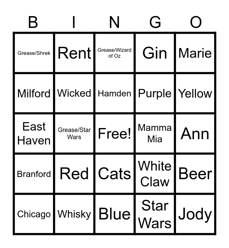 This bingo card has a free space and 25 words: Red, Blue, Hamden, Chicago, Marie, Grease/Shrek, Milford, Rent, Mamma Mia, Cats, Purple, East Haven, White Claw, Beer, Wicked, Grace, Ann, Grease/Wizard of Oz, Yellow, Grease/Star Wars, Jody, Whisky, Branford, Gin and Star Wars.