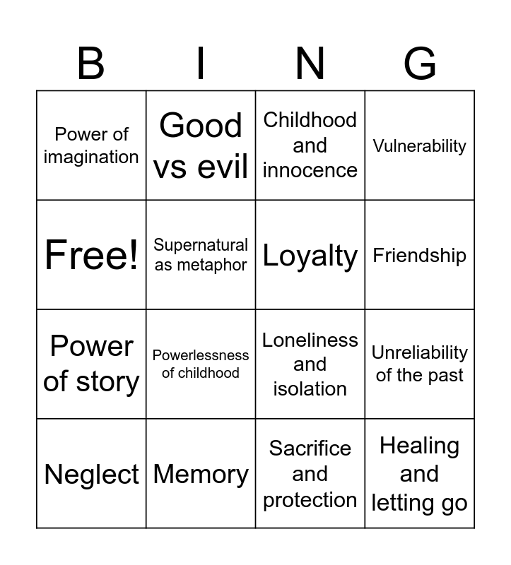 This bingo card has 16 words: Memory, Unreliability of the past, Childhood and innocence, Power of imagination, Power of story, Good vs evil, Loneliness and isolation, Sacrifice and protection, Free!, Supernatural as metaphor, Neglect, Vulnerability, Powerlessness of childhood, Friendship, Loyalty and Healing and letting go.
