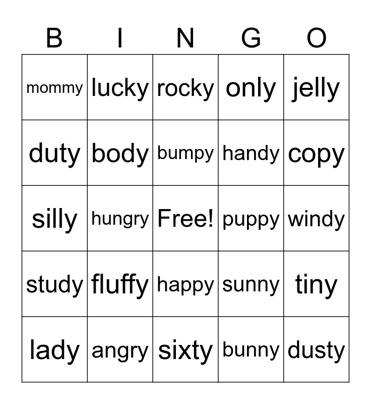 This bingo card has a free space and 24 words: fluffy, angry, bumpy, lady, jelly, mommy, duty, lucky, puppy, happy, handy, silly, sunny, tiny, body, bunny, windy, rocky, copy, hungry, dusty, study, only and sixty.