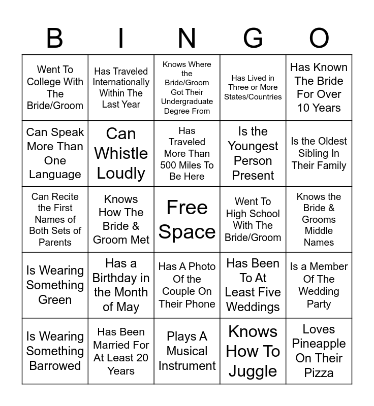 This bingo card has a free space and 24 words: Has a Birthday in the Month of May, Has Been Married For At Least 20 Years, Has Traveled More Than 500 Miles To Be Here, Is Wearing Something Barrowed, Has Known The Bride For Over 10 Years, Went To College With The Bride/Groom, Can Speak More Than One Language, Has Traveled Internationally Within The Last Year, Went To High School With The Bride/Groom, Has A Photo Of the Couple On Their Phone, Is the Youngest Person Present, Can Recite the First Names of Both Sets of Parents, Has Been To At Least Five Weddings, Is a Member Of The Wedding Party, Can Whistle Loudly, Knows How To Juggle, Knows the Bride & Grooms Middle Names, Knows Where the Bride/Groom Got Their Undergraduate Degree From, Is the Oldest Sibling In Their Family, Knows How The Bride & Groom Met, Loves Pineapple On Their Pizza, Is Wearing Something Green, Has Lived in Three or More States/Countries and Plays A Musical Instrument.