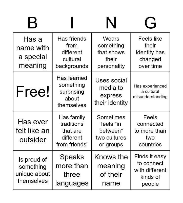 This bingo card has 16 words: Speaks more than three languages, Feels connected to more than two countries, Wears something that shows their personality, Has a name with a special meaning, Has ever felt like an outsider, Has friends from different cultural backgrounds, Sometimes feels "in between" two cultures or groups, Knows the meaning of their name, Free!, Has learned something surprising about themselves, Is proud of something unique about themselves, Feels like their identity has changed over time, Has family traditions that are different from friends', Has experienced a cultural misunderstanding, Uses social media to express their identity and Finds it easy to connect with different kinds of people.