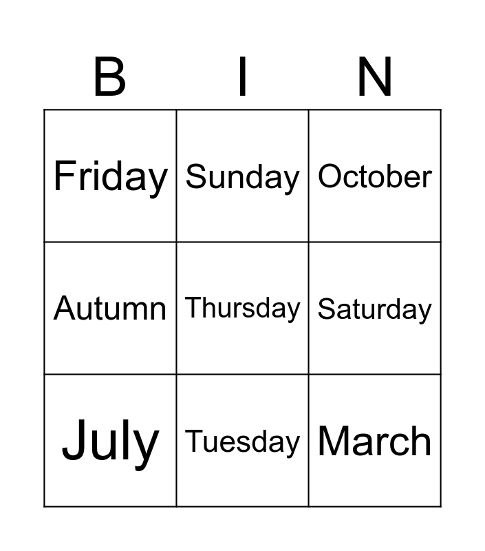 This bingo card has 24 words: Free!, Monday, Tuesday, Wednesday, Thursday, Friday, Saturday, Sunday, January, February, March, April, May, June, July, August, September, October, November, December, Spring, Summer, Autumn and Winter.