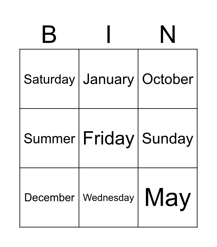 This bingo card has 23 words: Monday, Tuesday, Wednesday, Thursday, Friday, Saturday, Sunday, January, February, March, April, May, June, July, August, September, October, November, December, Spring, Summer, Autumn and Winter.