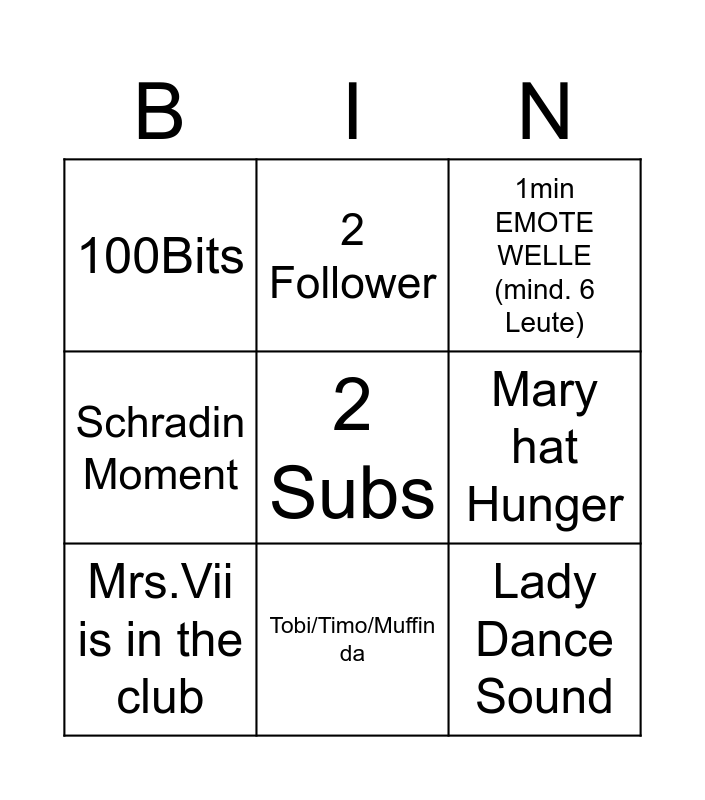 This bingo card has a free space and 8 words: Mary hat Hunger, 1min EMOTE WELLE (mind. 6 Leute), 2 Follower, Mrs.Vii is in the club, 100Bits, Lady Dance Sound, Schradin Moment and Tobi/Timo/Muffin da.