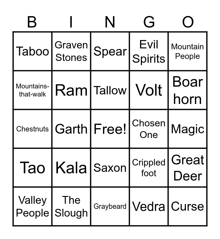 This bingo card has a free space and 29 words: Valley People, Shining stone, Garth, Secret Cavern, Taboo, Spear, Ram, Kala, Chosen One, The Slough, Magic, Curse, Graybeard, Vedra, Boar horn, Cave Painting, Saxon, Tao, Mountain People, Chestnuts, Crippled foot, Deerskin Pouch, Volt, Mountains-that-walk, Evil Spirits, Graven Stones, Great Deer, Tallow and Fish Oil.