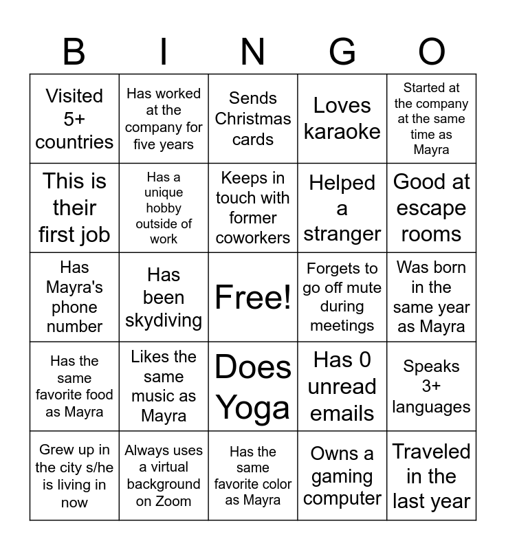 This bingo card has a free space and 24 words: Likes the same music as Mayra, Always uses a virtual background on Zoom, Keeps in touch with former coworkers, Grew up in the city s/he is living in now, Started at the company at the same time as Mayra, Visited 5+ countries, This is their first job, Has worked at the company for five years, Forgets to go off mute during meetings, Does Yoga, Helped a stranger, Has Mayra's phone number, Has 0 unread emails, Speaks 3+ languages, Has a unique hobby outside of work, Owns a gaming computer, Was born in the same year as Mayra, Sends Christmas cards, Good at escape rooms, Has been skydiving, Traveled in the last year, Has the same favorite food as Mayra, Loves karaoke and Has the same favorite color as Mayra.