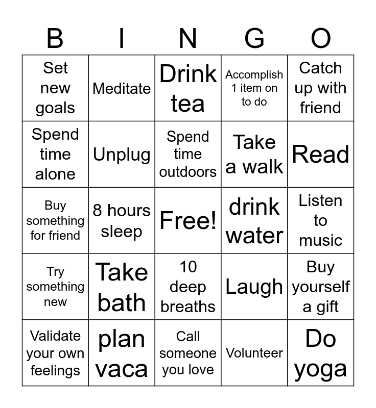 This bingo card has a free space and 39 words: Write in journal, Be active/exercise, Make gratitude list, Unplug, Validate your own feelings, 10 deep breaths, Spend time outdoors, Allow yourself to rest, Catch up with friend, Try something new, 8 hours sleep, Accomplish 1 item on to do, Do yoga, Listen to music, drink water, Take bath, Ask for help, Set new goals, Cook, Laugh, Spend time alone, Call someone you love, Take a walk, Read, Avoid drugs and alcohol, Declutter/clean, Watch a fav tv show, Eat healthy meal, Detox, Meditate, Practice hobbySay no, Get massage, Drink tea, plan vaca, Volunteer, Pack lunch, Buy yourself a gift, Buy something for friend and Set boundary.