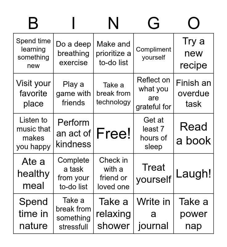 This bingo card has a free space and 24 words: Spend time in nature, Complete a task from your to-do list, Take a break from technology, Write in a journal, Try a new recipe, Spend time learning something new, Do a deep breathing exercise, Make and prioritize a to-do list, Get at least 7 hours of sleep, Read a book, Listen to music that makes you happy, Play a game with friends, Treat yourself, Laugh!, Visit your favorite place, Take a break from something stressfull, Take a relaxing shower, Compliment yourself, Finish an overdue task, Ate a healthy meal, Perform an act of kindness, Check in with a friend or loved one, Reflect on what you are grateful for and Take a power nap.