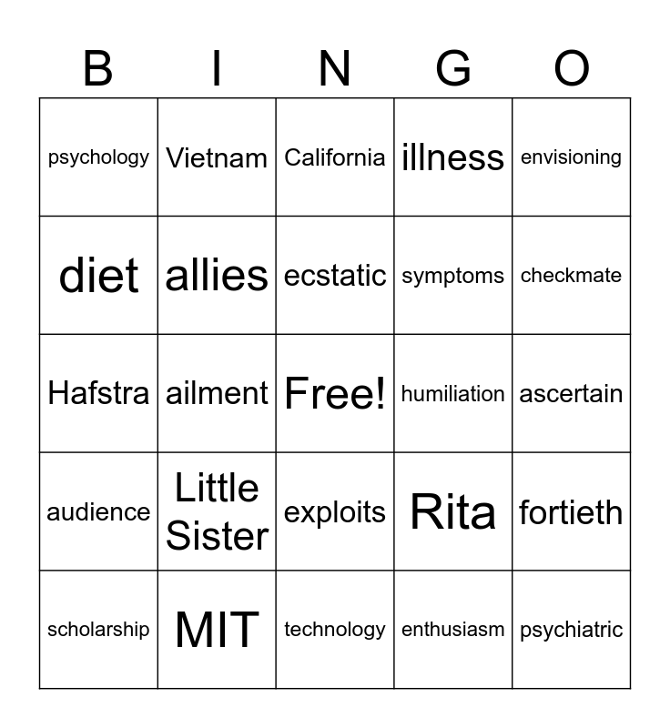 This bingo card has a free space and 34 words: positive, enthusiasm, calculate, spontaneously, audience, allies, envisioning, scholarship, Vietnam, validation, ecstatic, California, obstinate, predicament, humiliation, checkmate, MIT, Hafstra, Little Sister, Rita, exploits, Cobra, psychology, ascertain, technology, psychiatric, illness, episodes, symptoms, diet, indiscernible, ailment, fortieth and rummaging.