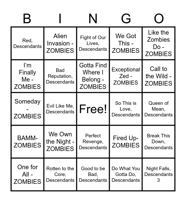 This bingo card has a free space and 30 words: Rotten to the Core, Descendants, If Only , Descendants, Evil Like Me, Descendants, Believe, Descendants, Red, Descendants, Fight of Our Lives, Descendants, Bad Reputation, Descendants, Perfect Revenge, Descendants, So This is Love, Descendants, Good to be Bad, Descendants, Queen of Mean, Descendants, Night Falls, Descendants 3, Do What You Gotta Do, Descendants, My Once Upon a Time, Descendants, Call to the Wild - ZOMBIES, Flesh & Bone - ZOMBIES, Fired Up- ZOMBIES, BAMM- ZOMBIES, We Own the Night - ZOMBIES, Like the Zombies Do - ZOMBIES, Someday - ZOMBIES, Our Year - ZOMBIES, Alien Invasion - ZOMBIES, Exceptional Zed - ZOMBIES, I’m Finally Me - ZOMBIES, We Got This - ZOMBIES, Break This Down, Descendants, One for All - ZOMBIES, Gotta Find Where I Belong - ZOMBIES and Stand - ZOMBIES.