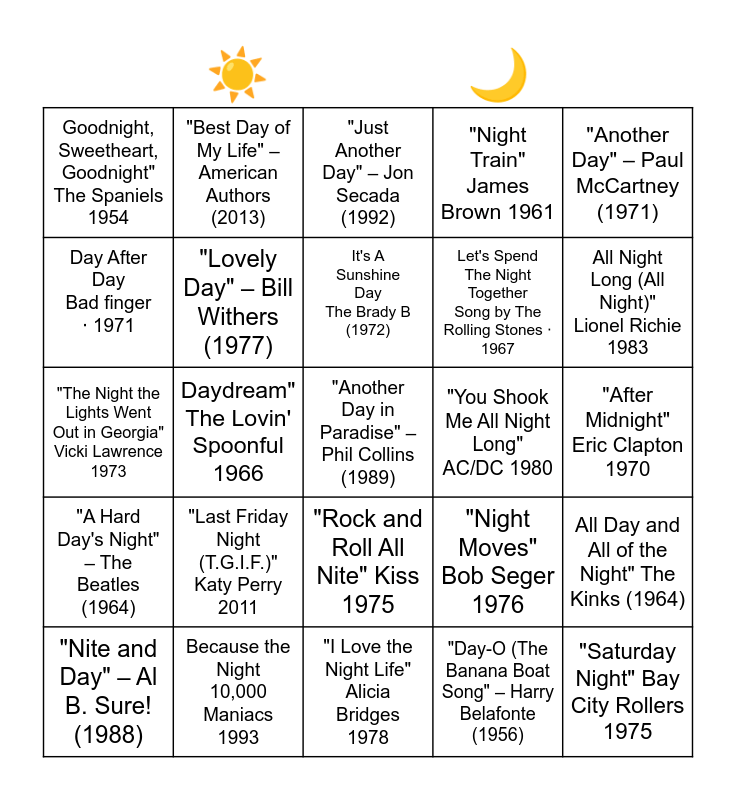 This bingo card has a free space and 34 words: "That'll Be the Day" – Buddy Holly and the Crickets 1957, "Day-O (The Banana Boat Song" – Harry Belafonte (1956), “It’s a Good Day” – Peggy Lee 1950, "Daydream Believer" – The Monkees (1967), "A Hard Day's Night" – The Beatles (1964), "Lovely Day" – Bill Withers (1977), "Another Day" – Paul McCartney (1971), "Nite and Day" – Al B. Sure! (1988), "Best Day of My Life" – American Authors (2013), "Perfect Day" – Lou Reed (1972), It's A Sunshine Day The Brady B (1972), "Just Another Day" – Jon Secada (1992), Good Day Sunshine The Beatles ‧ 1966, Daylight Song by Maroon 5 ‧2012, "You Shook Me All Night Long" AC/DC 1980, All Night Long (All Night)" Lionel Richie 1983, Because the Night 10,000 Maniacs 1993, "The Night the Lights Went Out in Georgia" Vicki Lawrence 1973, "Last Friday Night (T.G.I.F.)" Katy Perry 2011, "Night Moves" Bob Seger 1976, "Rock and Roll All Nite" Kiss 1975, One Night in Bangkok" Murray Head 1985, Goodnight, Sweetheart, Goodnight" The Spaniels 1954, "After Midnight" Eric Clapton 1970, "I Love the Night Life" Alicia Bridges 1978, "Saturday Night" Bay City Rollers 1975, "Night Train" James Brown 1961, "One Night" Elvis Presley 1958, Let's Spend The Night Together Song by The Rolling Stones ‧ 1967, Day After Day Bad finger ‧ 1971, This Is the Day Song by The The ‧ 1983, Daydream" The Lovin' Spoonful 1966, All Day and All of the Night" The Kinks (1964) and Every Day is a Winding Road" Sheryl Crow 1996.