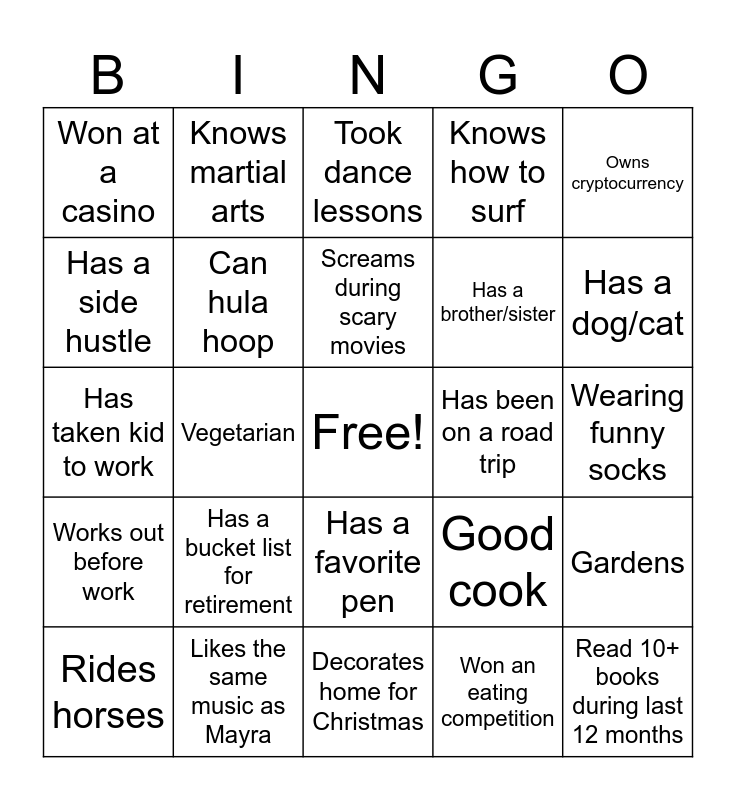 This bingo card has a free space and 24 words: Has a bucket list for retirement, Likes the same music as Mayra, Screams during scary movies, Rides horses, Owns cryptocurrency, Won at a casino, Has a side hustle, Knows martial arts, Has been on a road trip, Has a favorite pen, Has a brother/sister, Has taken kid to work, Good cook, Gardens, Can hula hoop, Won an eating competition, Wearing funny socks, Took dance lessons, Has a dog/cat, Vegetarian, Read 10+ books during last 12 months, Works out before work, Knows how to surf and Decorates home for Christmas.