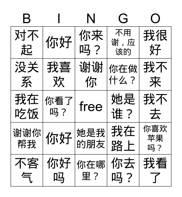 This bingo card has a free space and 24 words: 你好, 你好吗, 谢谢你, 不客气, 我很好, 对不起, 没关系, 你好, 她是谁?, 她是我的朋友, 你在做什么?, 我在吃饭, 我在路上, 你喜欢苹果吗?, 我喜欢, 你去吗?, 我不去, 你来吗?, 我不来, 你看了吗?, 我看了, 谢谢你帮我, 不用谢,应该的 and 你在哪里?.