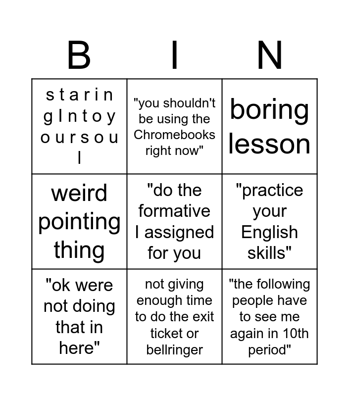 This bingo card has a free space and 8 words: "practice your English skills", boring lesson, "you shouldn't be using the Chromebooks right now", "ok were not doing that in here", s t a r i n g I n t o y o u r s o u l, "the following people have to see me again in 10th period", weird pointing thing and not giving enough time to do the exit ticket or bellringer.