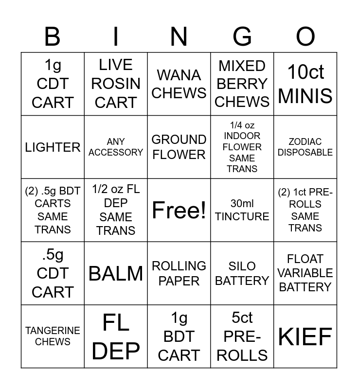 This bingo card has a free space and 24 words: BALM, FL DEP, GROUND FLOWER, TANGERINE CHEWS, 10ct MINIS, 1g CDT CART, LIGHTER, LIVE ROSIN CART, 30ml TINCTURE, ROLLING PAPER, 1/4 oz INDOOR FLOWER SAME TRANS, (2) .5g BDT CARTS SAME TRANS, SILO BATTERY, FLOAT VARIABLE BATTERY, ANY ACCESSORY, 5ct PRE-ROLLS, (2) 1ct PRE-ROLLS SAME TRANS, WANA CHEWS, ZODIAC DISPOSABLE, 1/2 oz FL DEP SAME TRANS, KIEF, .5g CDT CART, MIXED BERRY CHEWS and 1g BDT CART.