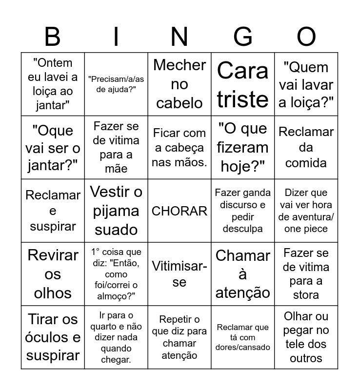 This bingo card has a free space and 24 words: 1° coisa que diz: "Então, como foi/correi o almoço?", Ir para o quarto e não dizer nada quando chegar., Ficar com a cabeça nas mãos., Tirar os óculos e suspirar, "Quem vai lavar a loiça?", "Ontem eu lavei a loiça ao jantar", "Oque vai ser o jantar?", "Precisam/a/as de ajuda?", Fazer ganda discurso e pedir desculpa, Vitimisar-se, "O que fizeram hoje?", Reclamar e suspirar, Chamar à atenção, Fazer se de vitima para a stora, Fazer se de vitima para a mãe, Reclamar que tá com dores/cansado, Dizer que vai ver hora de aventura/ one piece, Mecher no cabelo, Reclamar da comida, Vestir o pijama suado, Olhar ou pegar no tele dos outros, Revirar os olhos, Cara triste and Repetir o que diz para chamar atenção.