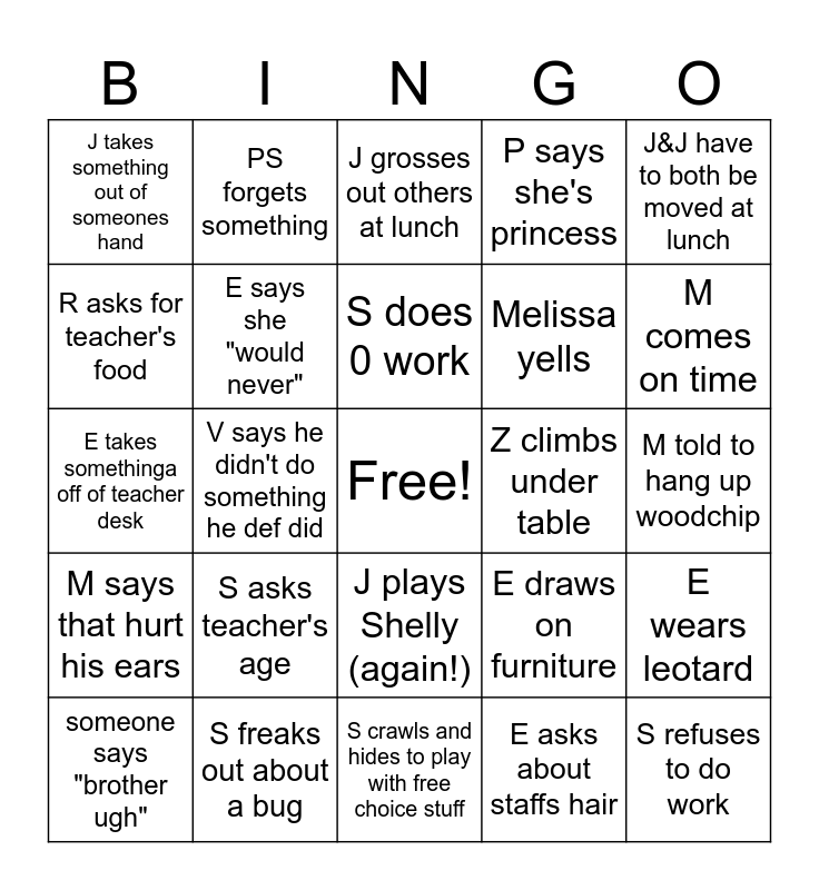 This bingo card has a free space and 24 words: S asks teacher's age, S freaks out about a bug, S does 0 work, someone says "brother ugh", J&J have to both be moved at lunch, J takes something out of someones hand, R asks for teacher's food, PS forgets something, Z climbs under table, J plays Shelly (again!), Melissa yells, E takes somethinga off of teacher desk, E draws on furniture, E wears leotard, E says she "would never", E asks about staffs hair, M told to hang up woodchip, J grosses out others at lunch, M comes on time, V says he didn't do something he def did, S refuses to do work, M says that hurt his ears, P says she's princess and S crawls and hides to play with free choice stuff.
