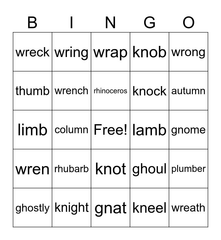 This bingo card has a free space and 29 words: ghostly, numb, column, know, wreck, wrap, wrench, rhubarb, lamb, knight, gnome, wreath, gnat, kneel, autumn, crumb, knot, wren, wrong, limb, ghoul, gnaw, knock, thumb, knob, wring, plumber, rhinoceros and knit.
