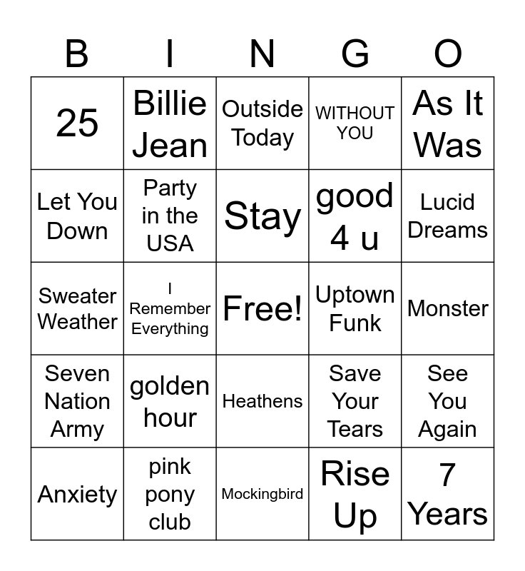 This bingo card has a free space and 24 words: golden hour, pink pony club, Stay, Anxiety, As It Was, 25, Let You Down, Billie Jean, Uptown Funk, Heathens, good 4 u, Sweater Weather, Save Your Tears, See You Again, Party in the USA, Rise Up, Monster, Outside Today, Lucid Dreams, I Remember Everything, 7 Years, Seven Nation Army, WITHOUT YOU and Mockingbird.