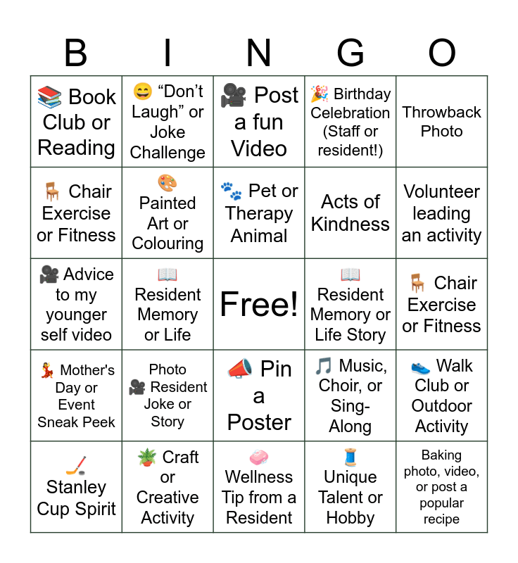 This bingo card has a free space and 24 words: Photo π₯ Resident Joke or Story, πͺ΄ Craft or Creative Activity, πΎ Pet or Therapy Animal, π Stanley Cup Spirit, Throwback Photo, π Book Club or Reading, πͺ Chair Exercise or Fitness, π βDonβt Laughβ or Joke Challenge, π Resident Memory or Life Story, π£ Pin a Poster, Acts of Kindness, π₯ Advice to my younger self video, π΅ Music, Choir, or Sing-Along, π Walk Club or Outdoor Activity, π¨ Painted Art or Colouring, π§΅ Unique Talent or Hobby, πͺ Chair Exercise or Fitness, π₯ Post a fun Video, Volunteer leading an activity, π Resident Memory or Life, Baking photo, video, or post a popular recipe, π Mother's Day or Event Sneak Peek, π Birthday Celebration (Staff or resident!) and π§Ό Wellness Tip from a Resident.